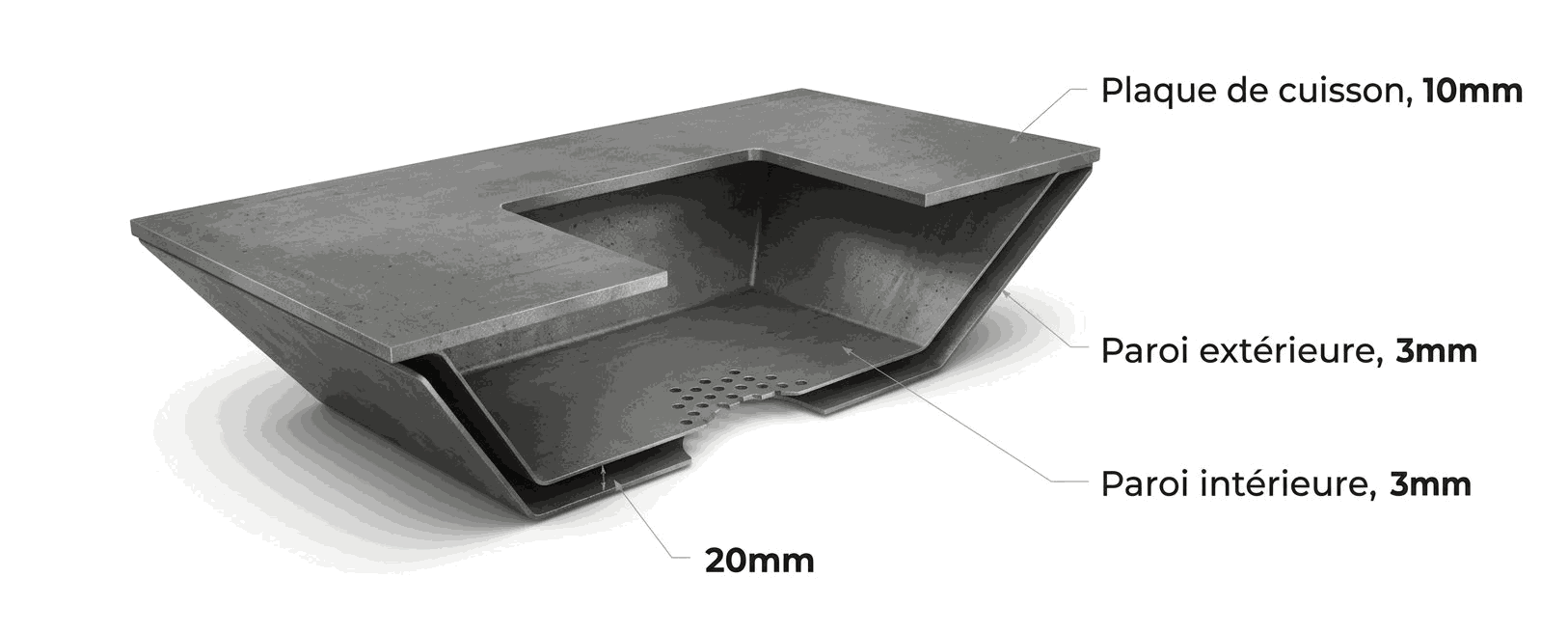- Composés d’un corps de chauffe robuste conçu en double peau et d’une plaque de cuisson de 10 mm d’épaisseur ;